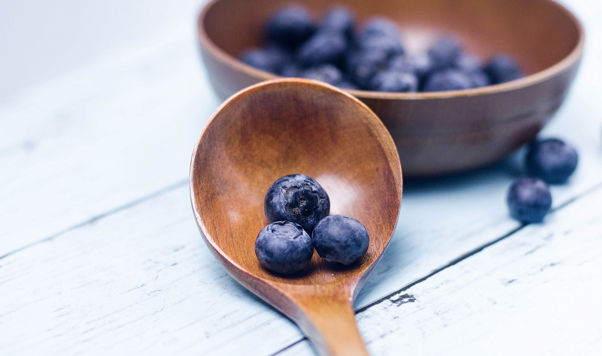 Image of blueberries in a wooden spoon and bowl by Allan Lau from Pixabay.