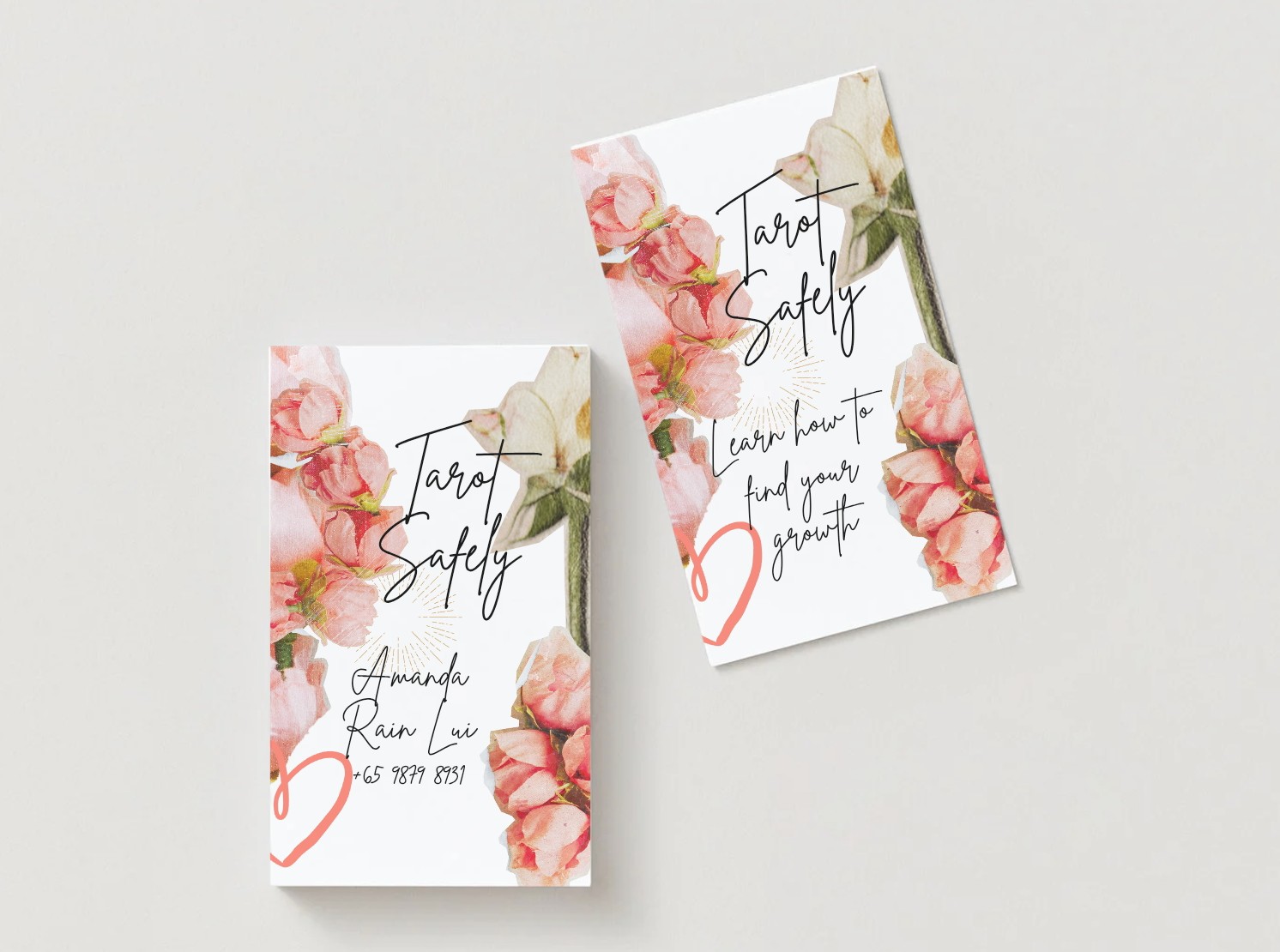 I always wanted to do tarot. I’ve been told not to use “witch” for now, which is okay. I’ve started tarotsafely.com. I made a name card design, which I like for now.